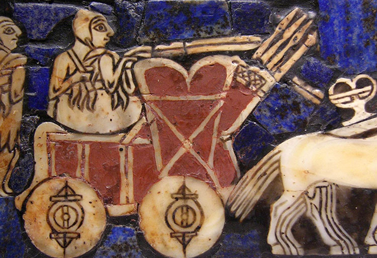 A depiction of an onager-drawn cart on the Sumerian “War” panel of the Standard of Ur (c. 2500 BCE)