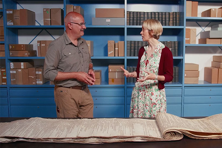 Professor Michael Livingstone and Dr Jessica Nelson, Head of Collections at the National Archives, view an exchequer roll which describes details about William Wallace’s death.