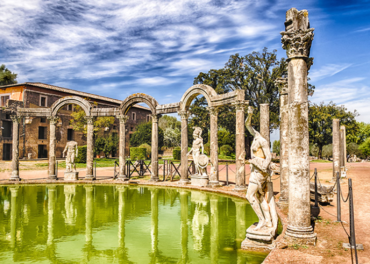 Hadrian’s Villa covers almost 250 acres and consists of over 30 buildings and a number of other points of interest. The site includes the remains of a large colonnaded swimming pool, libraries, the Palestra, barracks, gardens, fountains, nymphaeums, and the famous Maritime Theatre.