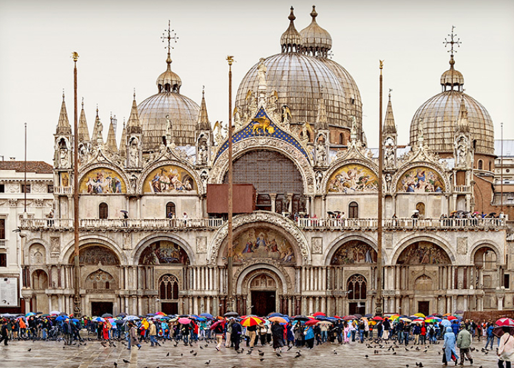 Saint Mark’s Basilica is a world famous Byzantine cathedral in Venice’s St. Mark’s Square, sometimes known as Chiesa d’Oro or “Church of Gold”. Every aspect of the basilica is on a grand scale, from its three-part façade with ornate theological carvings to its Greek cross-shaped interior with its ceilings covered in golden mosaics. In fact, the basilica is so elaborate that its entrance or “narthex” is intended to prepare visitors for what they are about to see.