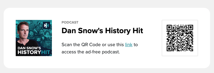 Once you’ve signed up to History Hit, you will be directed to a page that lists out all of our podcast series with a QR code next to it. Here’s an example of Dan Snow’s History Hit.