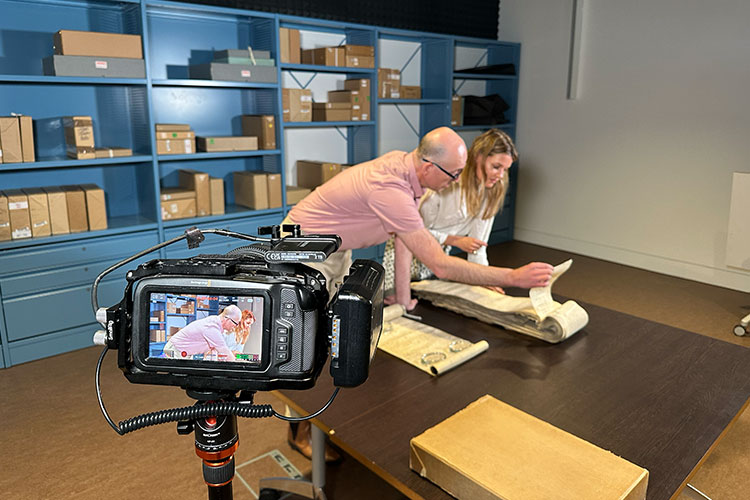 Dr Helen Carr with Dr Paul Dryburgh, principal record specialist at The National Archives, during filming. They are looking at a Charter drawn up by Edward II (less than a month after he became king), bestowing on Piers Gaveston the Earldom of Cornwall.