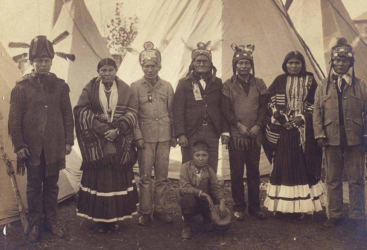 Geronimo and seven other Apache men, women and a boy posed in front of tents at the Louisiana Purchase Exposition, St. Louis. 1904