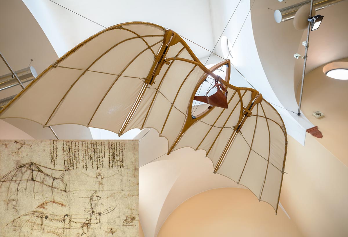 The renaissance genius Leonardo da Vinci had many ideas on how humans could take flight. This design follows a common idea of emulating bird or bat wings. There are legends that Leonardo Da Vinci tried out his invention with one of his apprentices, though the lack of concrete evidence casts doubt on these claims.