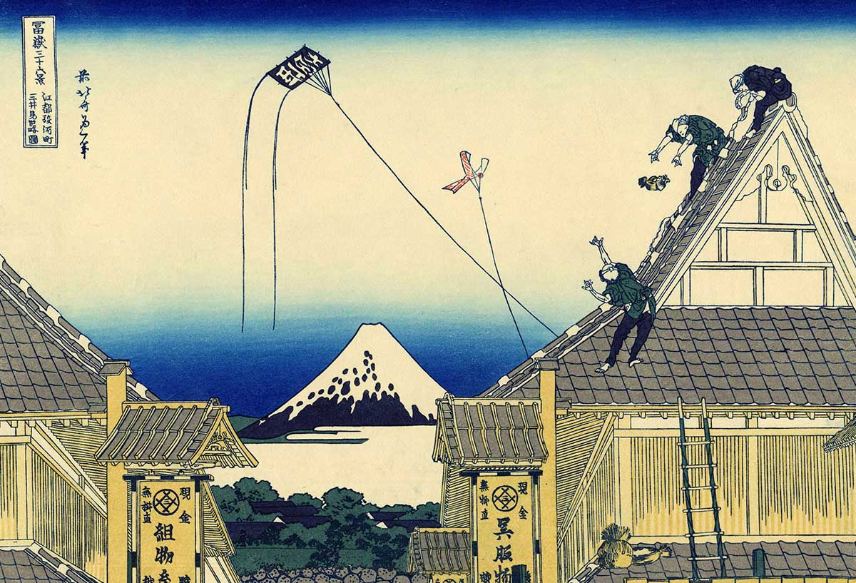 Kites fly on top of the Mitsui Store where the craftsmen are working on top of the roof, print by Hokusai