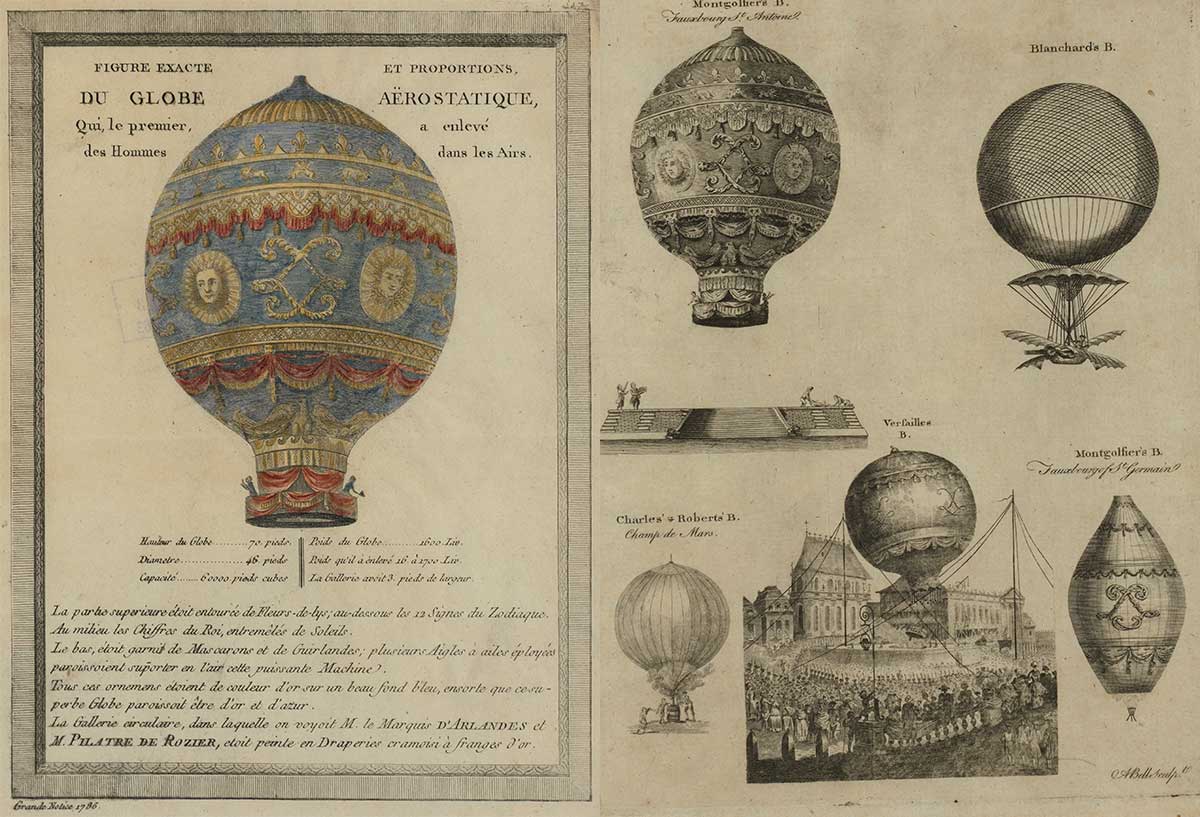1786 description of the historic Montgolfier Brothers’ 1783 balloon flight (left) / Book illustration shows five early balloon ascensions in France (right)