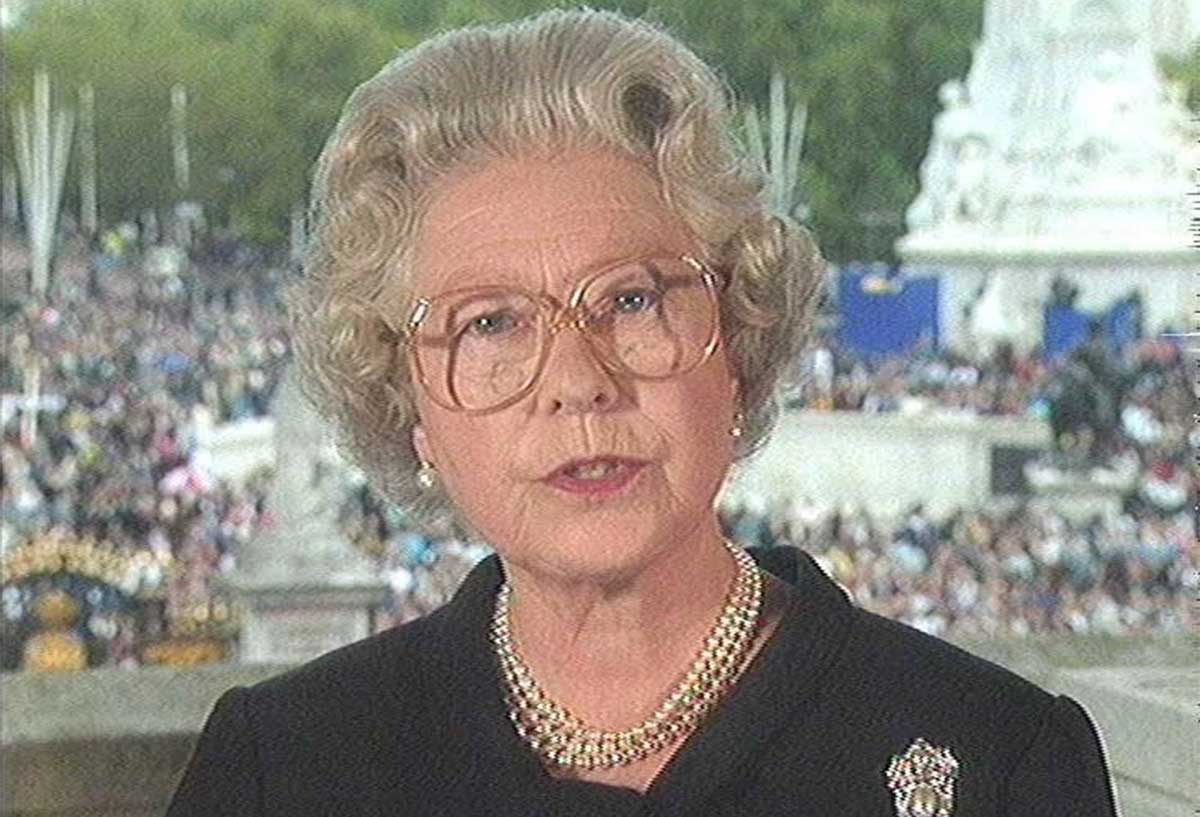 The Queen addressing the nation on 5 September 1997 from Buckingham Palace, where she told of the Royal Family’s sorrow at the death of Diana, Princess of Wales. It was only the second time in her reign that the Queen had addressed the nation. Speaking “as a grandmother”, the Queen’s live speech had a big impact on the public, and was a moving moment after frustrations that the monarchy had been quiet in the days immediately after Diana’s death and had taken too long to return to London from Balmoral
