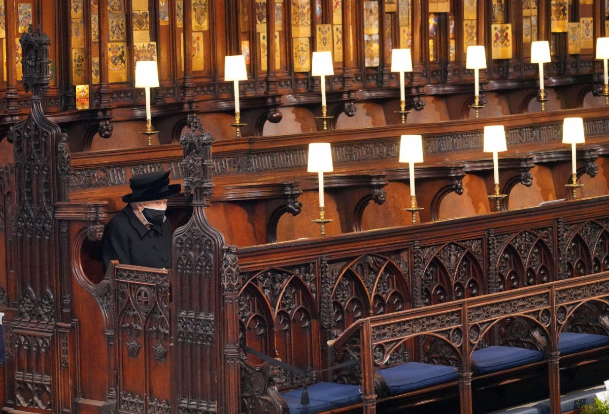 Queen Elizabeth II at the funeral of the Duke of Edinburgh in St George’s Chapel, Windsor Castle, Berkshire, 17 April 2021.