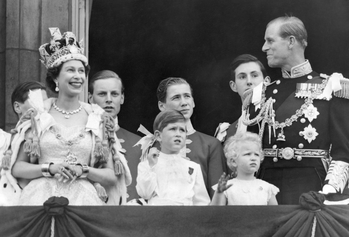 Queen Elizabeth II, the Prince of Wales, the Princess Royal and the Duke of Edinburgh on the Buckingham Palace balcony after the Queen’s coronation, 2 June 1953.
