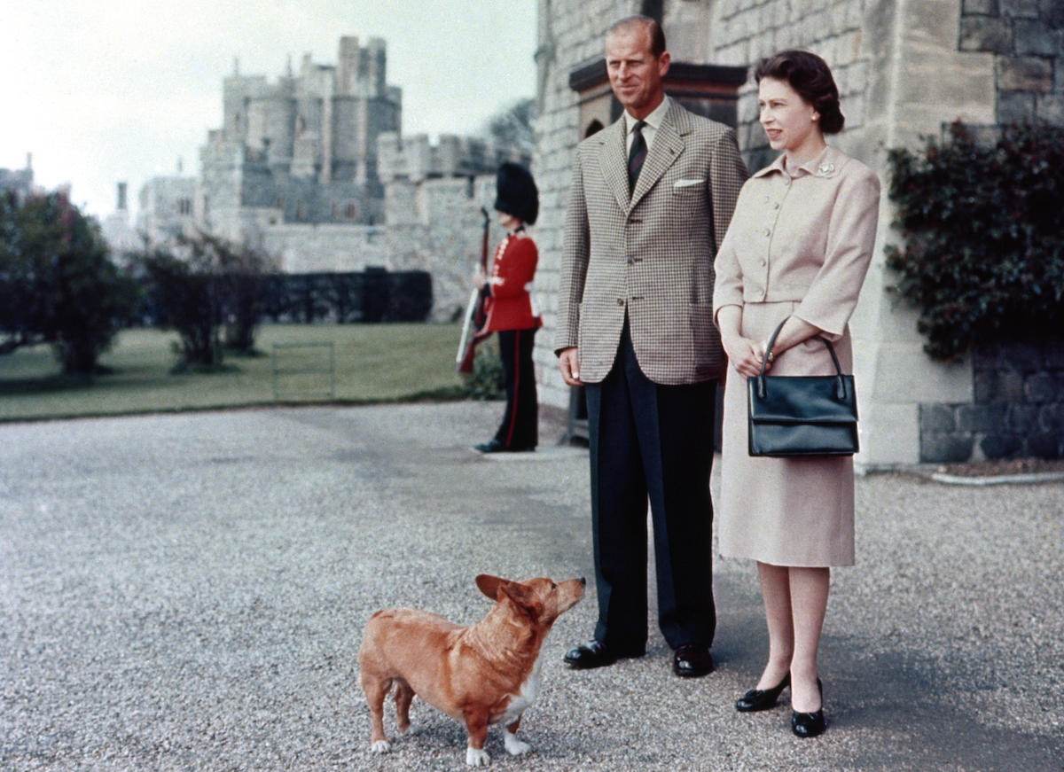 Queen Elizabeth II and the Duke of Edinburgh at Windsor joined by Sugar, one of the royal corgis, in 1959.