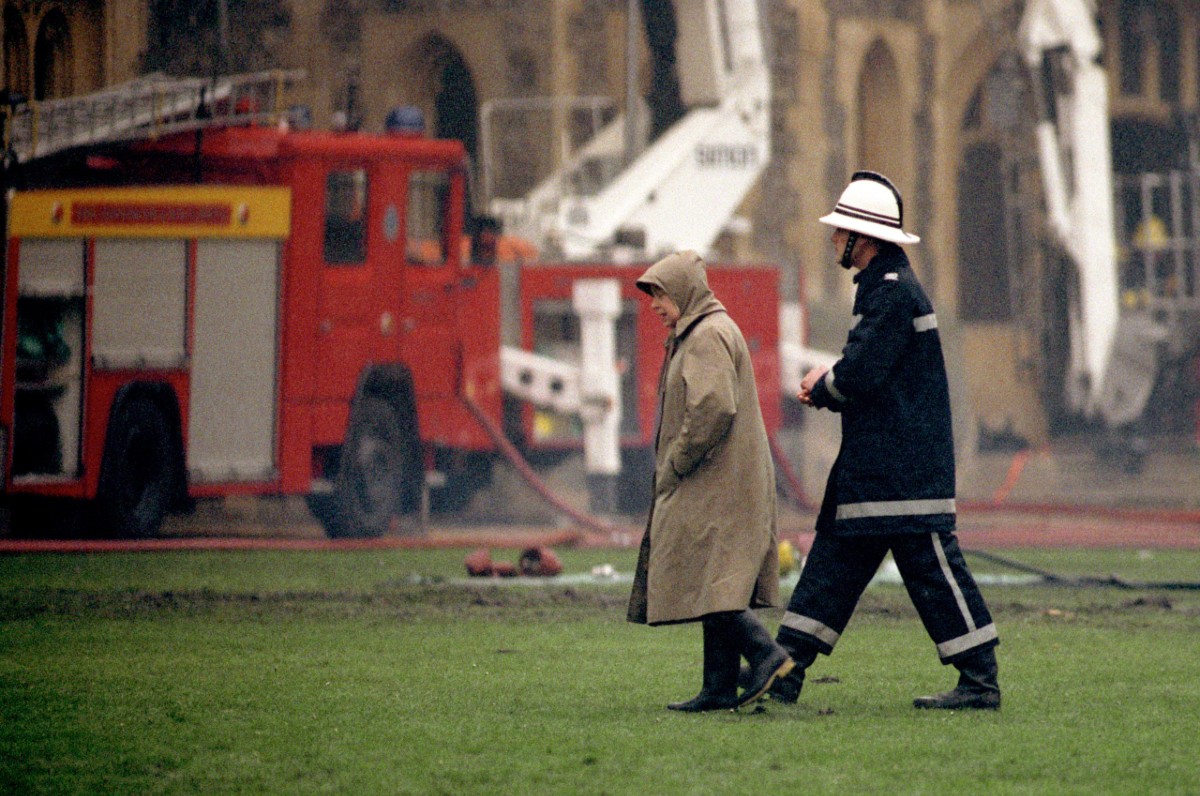 Queen Elizabeth II surveying the scene at Windsor Castle following the fire there in November 1992. The year had seen numerous scandals for the royal family, causing the Queen to later refer to 1992 as her “Annus Horribilis”.