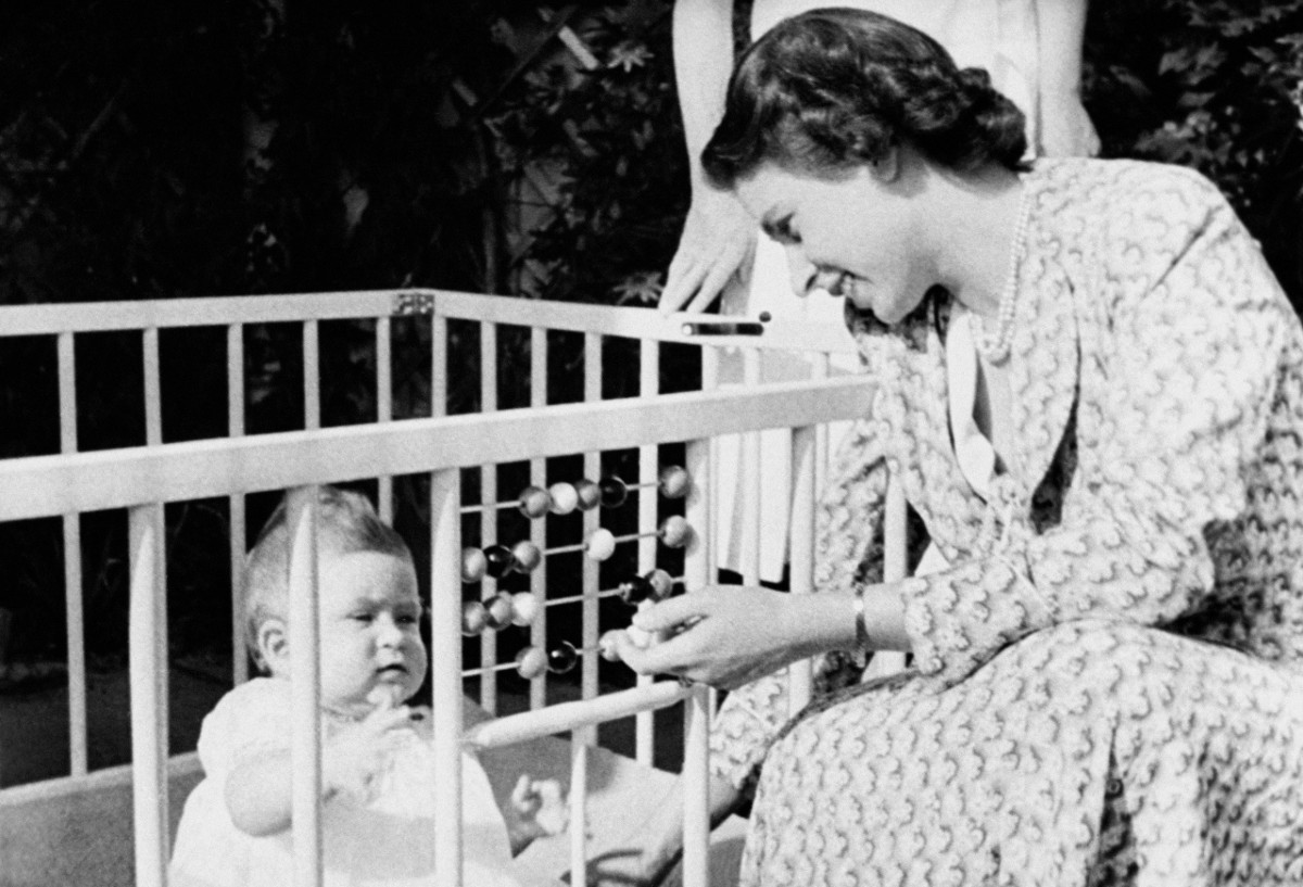 Queen Elizabeth II with Prince Charles, in the grounds of Windlesham Moor in Surrey, 18 July 1949.