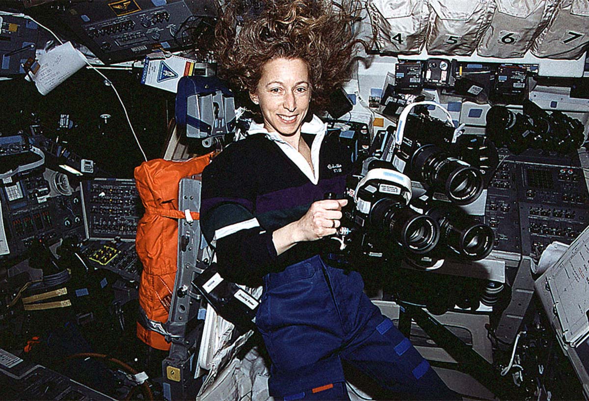 Astronaut Marsha S. Ivins, mission specialist, prepares to aim three Hasselblad cameras through the overhead windows of the Earth-orbiting Space Shuttle Columbia. The three cameras were allowed to simultaneously record the same imagery on different types of film. 04 March 1994