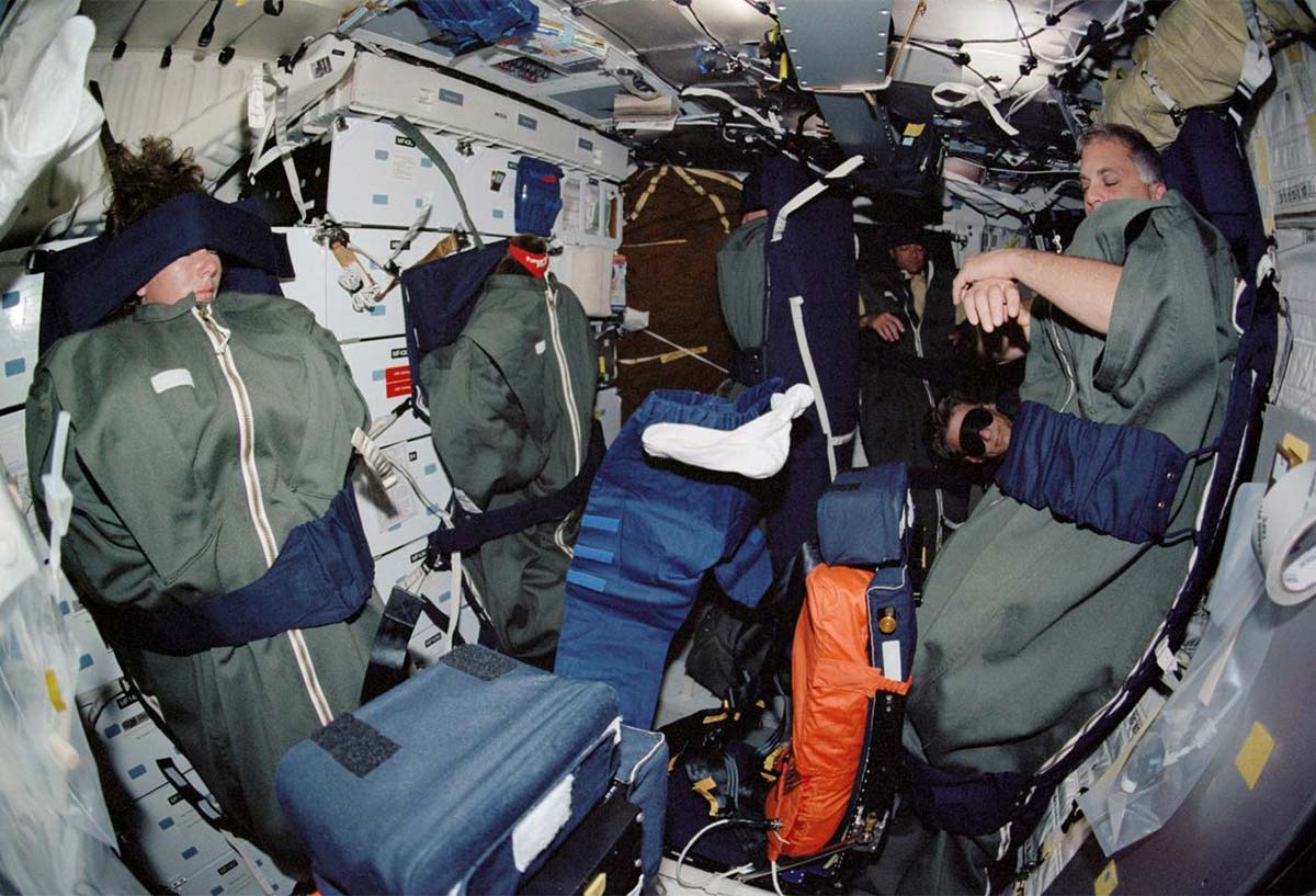 The STS-112 crew-members sleep on the mid-deck of the Space Shuttle Atlantis. Pictured are astronauts Sandra H. Magnus, David A. Wolf, Piers J. Sellers, mission specialists, and Jeffrey S. Ashby, mission commander. 18 October 2002