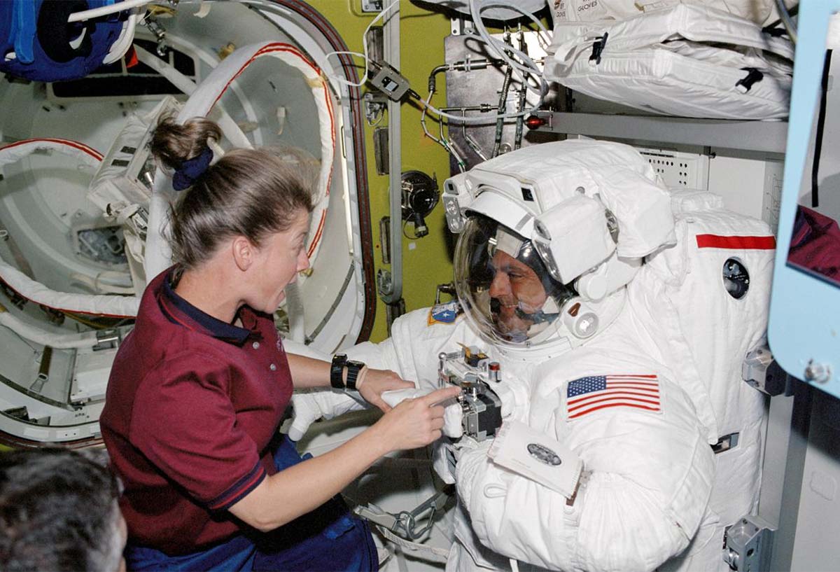 Astronaut Pamela A. Melroy, STS-112 pilot, assists astronaut David A. Wolf, mission specialist, with the final touches on his Extravehicular Mobility Unit (EMU) spacesuit