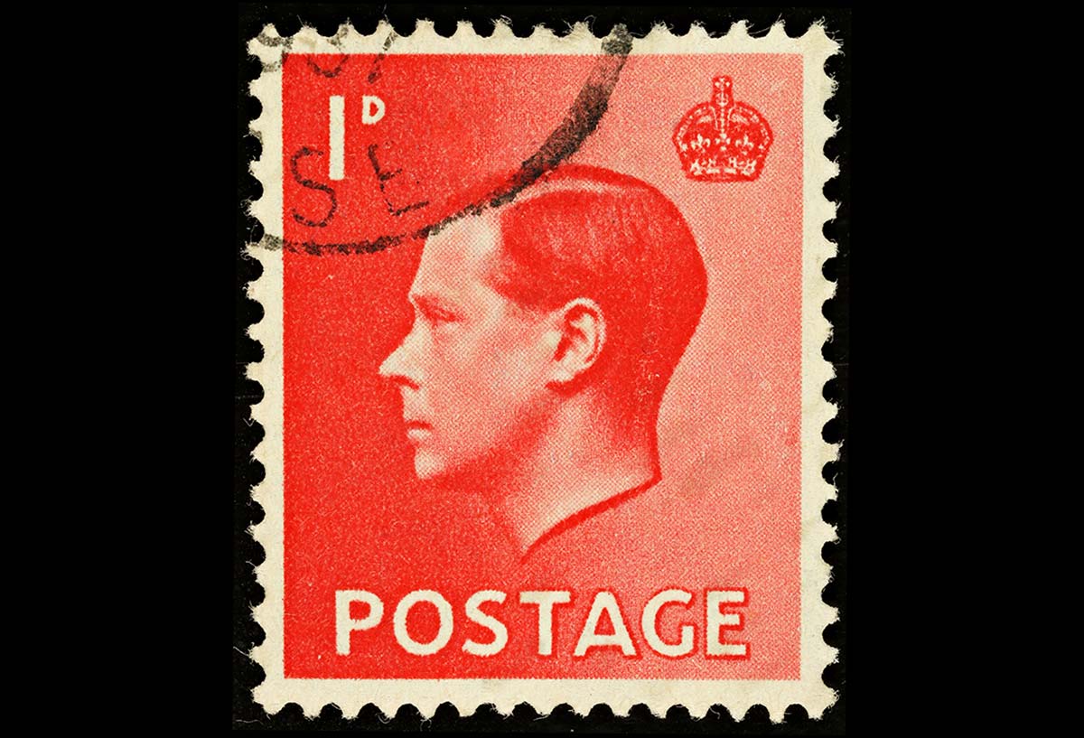 An English One Pence Red used postage stamp showing the portrait of King Edward VIII, circa 1936